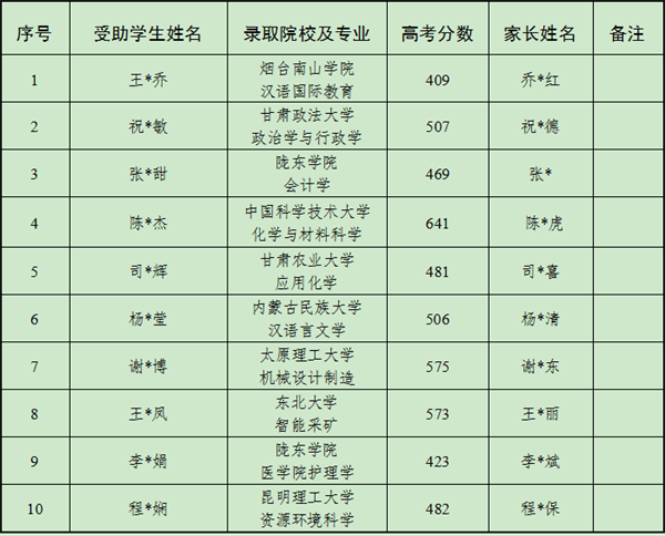 根据《关于联合开展第二十八届“芙蓉学子”公益助学项目的函》要求,通过学生本人申请,经审核,确定以下 10 人受助。现将名单公示如下: