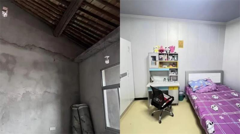 通过专业团队的重新规划、贴心设计与精心装修,一间间原本简陋狭小的房间,摇身一变成为功能齐全、温馨舒适的独立空间,书桌、衣柜、床品、照明等设施一应俱全,既解决了孩子们学习生活环境简陋的现实难题,更用整洁有序的空间为他们搭建起隔绝风雨、安放心灵的“安全岛”。
